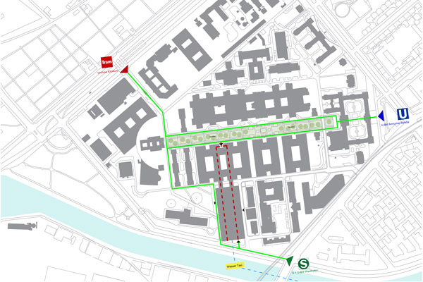 diskursives Verfahren, Charité Campus Virchow-Klinikum Um seiner zentralen Rolle im Campus gerecht zu werden, werden zwei Haupteingänge für das UHZB vorgeschlagen: Ein zentraler Eingang befindet sich angrenzend an einen kleinen Platz zum Spandauer Schifffahrtskanal am Nordufer. Er bildet benachbart zum jetzt bestehenden Deutschen Herzzentrum eine neue markante Adresse für das UHZB in der Stadt. Zukünftig wird ein weiterer Haupteingang an der Mittelallee die Südschiene über eine Magistrale mit dem UHZB verbinden. Die ZNA wird sich an der Ostseite des Gebäudes befinden. |
