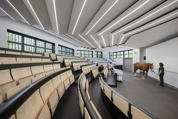 Freie Universität Berlin Department of Veterinary Medicine reconstruction Clinic for Horses with a lecture hall The Clinic for Horses is part of the Department of Veterinary Medicine at Free University of Berlin and is located next to the Small Animal Clinic on the site of the former Düppel manor on the southwestern outskirts of Berlin adjacent to a protected landscape. The clinic ensamble consists of three buildings, the clinic building with a polygonal lecture hall docked to the side and two associated stable buildings as well as a lunging hall. Between the clinic building and the adjoining stable there is a roofed trot up section with tartan paving. The architects adapted the clinic and teaching buildings to current medical requirements. The structural order remains unchanged, the functional assignments make clever use of the different floor heights within the ground floor and upper floor. In the newly designed lecture hall, horse diseases are presented on the living object. The two stable buildings are used for patient admission, pre- and post-operative surgical care and comply with the requirements of internal medicine. |